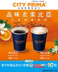 2025/10/01~2025/10/14 CITY PRIMA 品味衣索比亞 花香細膩綻放!買中杯精品美式/精品拿鐵,衣索比亞豆贈OPENPOINT 10點(點數使用期間至2025/12/31)