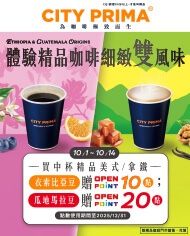 2025/10/01~2025/10/14 CITY PRIMA 體驗精品咖啡細緻雙風味!買中杯精品美式/精品拿鐵,衣索比亞豆贈OPENPOINT 10點;瓜地馬拉豆贈OPENPOINT 20點(點數使用期間至2025/12/31)