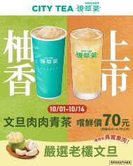 2025/10/01~2025/10/14 CITY TEA 嚴選老欉文旦 喝得到真實果肉!文旦肉肉青茶 新上市 嚐鮮價70元(原價80元、冰/特大杯)