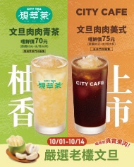 2025/10/01~2025/10/14 CITY CAFE 嚴選老欉文旦 柚香新上市!文旦肉肉青茶 嚐鮮價70元(原價80元、冰/特大杯)/文旦肉肉美式 嚐鮮價75元(原價85元、冰/特大杯)