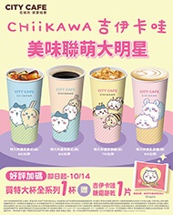 2025/10/01~2025/10/14 CITY CAFE 吉伊卡哇CHiiKAWA美味聯萌大明星!好評加碼!買特大杯全系列1杯贈吉伊卡哇糖霜餅乾1片(數量有限,依各門市庫存贈完為止)